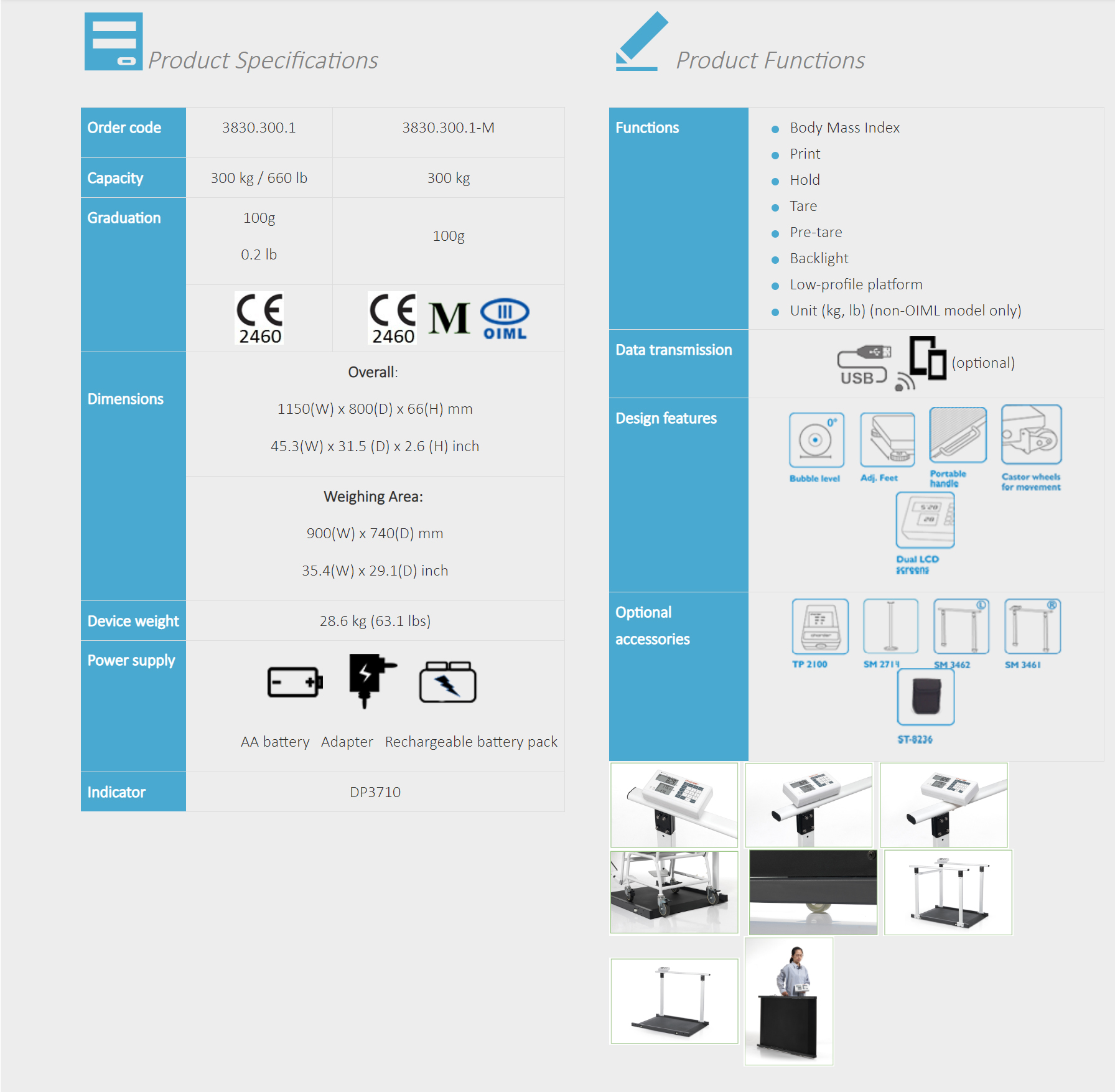 Cân xe lăn MS3830 công suất cao có thể cầm tay và dễ dàng vận chuyển trên bánh lăn. Tay vịn tùy chọn có thể được gắn vào để tăng sự ổn định.